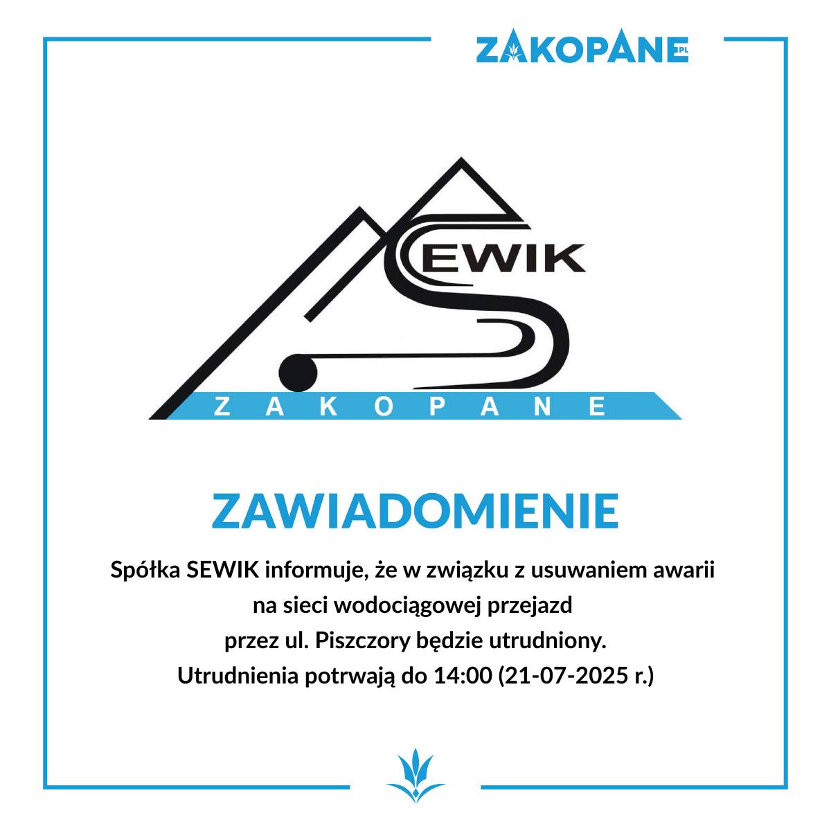 ZAKOPANE. Z powodu usuwania awarii na sieci wodociągowej, dzisiaj (21 lipca), do godz. 14 przejazd przez ul. Piszczory będzie utrudniony.