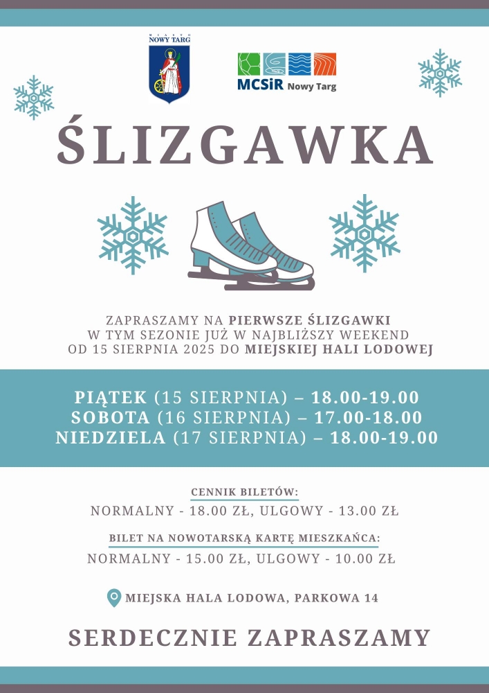 Miejska Hala Lodowa w Nowym Targu zaprasza na pierwsze ślizgawki sezonu 2025/2026. Inauguracyjne wejścia na lód odbędą się w dniach 15-17 sierpnia. W piątek 15 sierpnia ślizgawka potrwa od godz. 18.00 do 19.00, w sobotę 16 sierpnia od 17.00 do 18.00, a w niedzielę 17 sierpnia ponownie od 18.00 do 19.00.