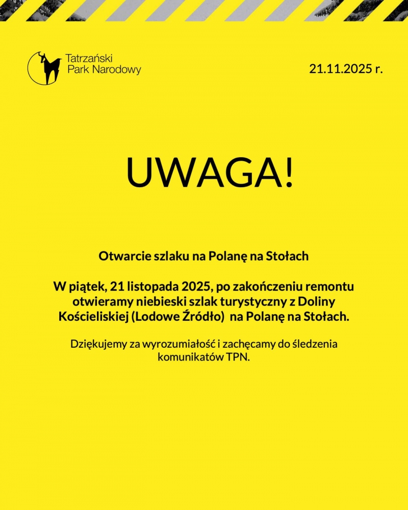 TATRY. W piątek, 21 listopada, po zakończeniu remontu otwarty został niebieski szlak turystyczny z Doliny Kościeliskiej (Lodowe Źródło) na Polanę na Stołac - poinformował Tatrzański Park Narodowy.