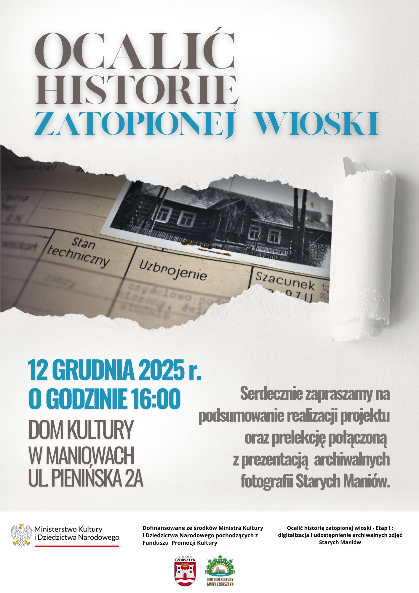 "Podczas spotkania przeniesiemy się do świata, którego już nie ma - zobaczymy archiwalne fotografie Starych Maniów oraz nowo powstałą wirtualną mapę wioski, stworzoną na podstawie zdigitalizowanych materiałów. To niezwykła okazja, żeby poznać historię miejsc i ludzi, którzy żyli tu przed budową Jeziora Czorsztyńskiego, podzielić się wspomnieniami i odkryć na nowo losy zatopionej miejscowości. Zdigitalizowane zdjęcia i efekty projektu można już oglądać online: zatopionewspomnienia.pl. Każde zdjęcie posiada możliwość dodania komentarza, jeśli ktoś zna dokładną lokalizację budynków, które nie zostały jeszcze oznaczone na mapie, zachęcamy do wpisywania informacji w komentarzach. Pozwoli nam to uzupełnić i wzbogacić wirtualną mapę" - wyjaśniają twórcy projektu, pracownicy Centrum Kultury Gminy Czorsztyn.