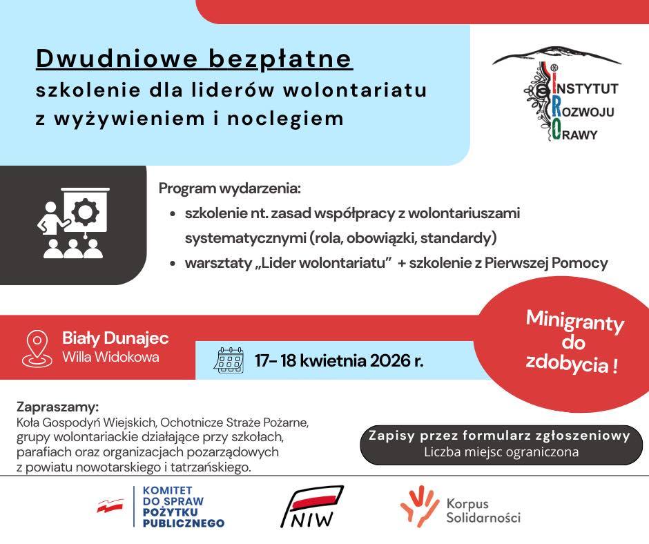 Podczas dwóch dni intensywnych warsztatów uczestnicy zdobędą praktyczną wiedzę z zakresu organizowania działań wolontariackich, animowania społeczności lokalnej oraz pracy zespołowej. Program obejmuje również szkolenie z pierwszej pomocy. Dodatkowo uczestnicy będą mieli możliwość ubiegania się o minigranty na realizację własnych inicjatyw wolontariackich.