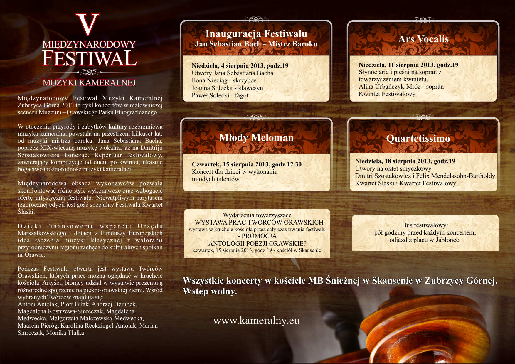 Repertuar festiwalowy, zawierający kompozycje od duetu po kwintet, ukazuje bogactwo i różnorodność muzyki kameralnej. Międzynarodowa obsada wykonawców pozwala skonfrontować różne style wykonawcze oraz wzbogacić ofertę artystyczną festiwalu. Niewątpliwym rarytasem tegorocznej edycji jest gość specjalny Festiwalu Kwartet Śląski. Dzięki finansowemu wsparciu Urzędu Marszałkowskiego i dotacji z Funduszy Europejskich idea łączenia muzyki klasycznej z walorami przyrodniczymi regionu zachęca do kulturalnych spotkań na Orawie.