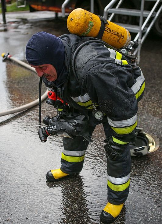 Przed przystąpieniem do ćwiczeń w samej komorze strażacy pokonywali dystans ok.800 m / 6 min/ biegiem, wyciskanie sztangi 35 kg – 15 razy i wejście po drabinie 4 m po dwa wejścia.