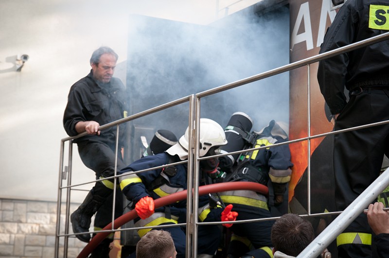 Podczas ćwiczeń strażacy używają prądów wodnych. Natarcie może być prowadzone przez drzwi, dach, okno oraz od dołu (poprzez właz).