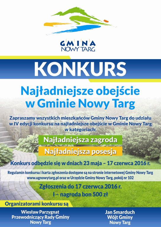 Zgłoszenia do konkursu można składać do 17 czerwca br. na formularzu dostępnym na stronie internetowej UG oraz w siedzibie Urzędu Gminy Nowy Targ pokój 102 wraz ze zdjęciami swojego obejścia.