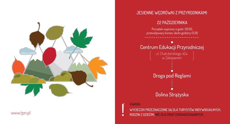 Najbliższa wycieczka odbędzie się w sobotę (22 października). Początek o godzinie 9.00 w Centrum Edukacji Przyrodniczej TPN (Chałubińskiego 42a). Zakończenie w Dolinie Strążyskiej. Potrwa ok. 4–5 godzin. Podczas wycieczki będziemy omawiać zagadnienia związane z lasami (ekologia lasów, sposoby zagospodarowania a strefowanie ochronne) oraz użytkowanie polan (koszenie, wypas) itp.