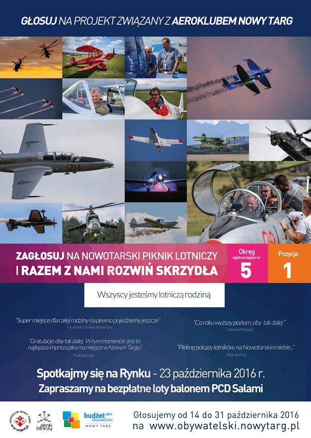 W okręgu ogólnomiejskim nr 5 zgłoszony został projekt pod poz. 1 – XIX Nowotarski Piknik Lotniczy Dowodem na to, że inicjatywa wpisuje się znakomicie w potrzeby mieszkańców naszego Miasta jest fakt, że Piknik uzyskuje Wasze poparcie już dwa lata z rzędu, za co serdecznie dziękujemy.