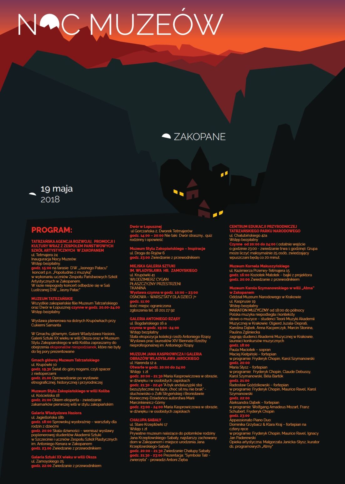 Muzeum Tatrzańskie - wszystkie zakopiańskie filie Muzeum Tatrzańskiego oraz Dwór w Łopusznej czynne w godz. 20.00-24.00. Wstęp bezpłatny