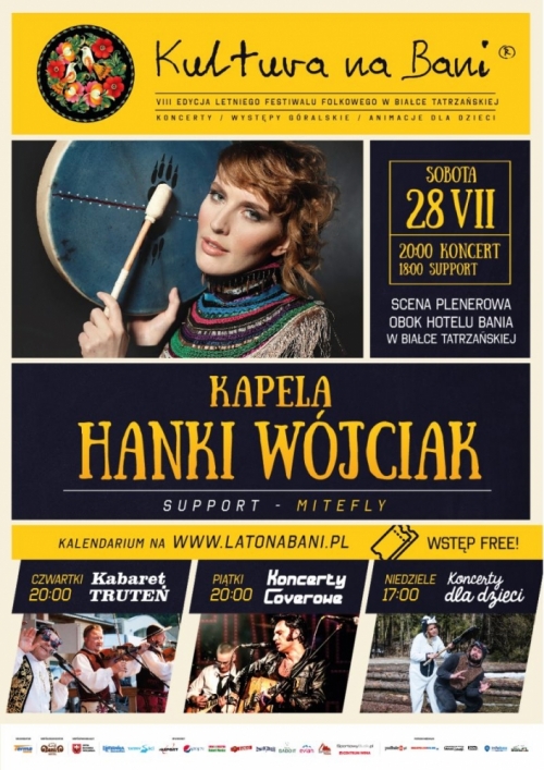 Sobotni koncert na Scenie Kultury na Bani to podróż do muzycznego raju z Kapelą Hanki Wójciak. W piosenkach Kapeli odnaleźć można echa muzyki orientalnej i celtyckiej, połamane rytmy, polskie motywy ludowe, śpiew rodem z Mongolii i Tuvy, wokalizy w rejestrze gwizdkowym… Hanka, założycielka zespołu, jest autorką słów i melodii. Na wspólnych próbach muzyka i aranże nabierają ostatecznego kształtu. Prostota i powtarzalność motywów przeplata się tutaj nieustannie z improwizacją, spokój z dzikością, radość ze smutkiem – to jest muzyka kolorowa! Scenę już od 18:00 będzie rozgrzewać support – zespół Mitefly, grający alternatywno-progresywno-przyjemny metal.