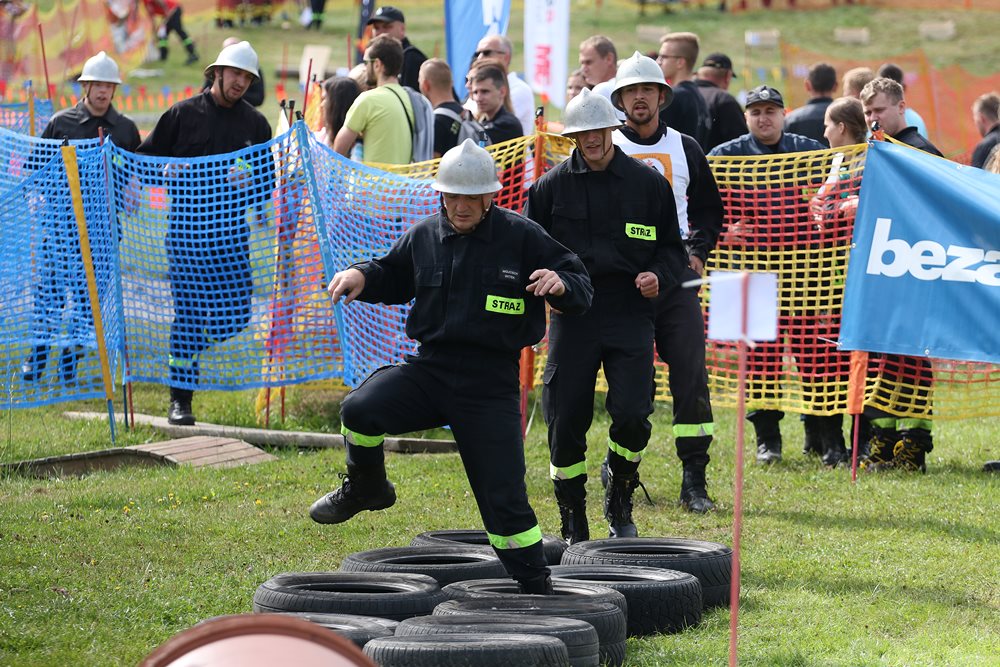 Dla milusińskich zorganizowano zawody na strażackim mini torze przeszkód.