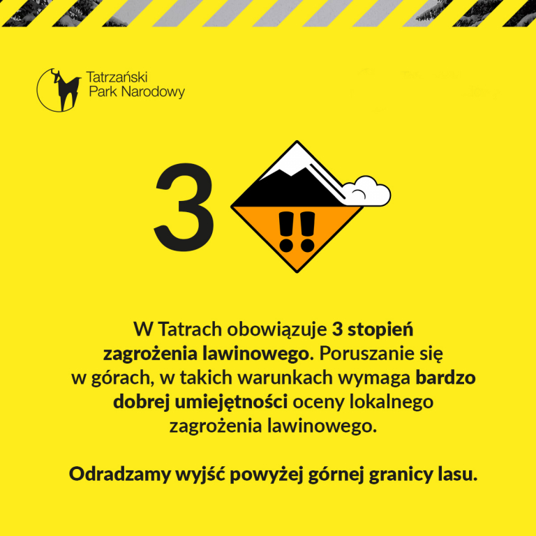 3 (znaczny) stopień nadal wiąże się z poważnym zagrożeniem lawinowym skutkującym możliwością samorzutnego zejścia dużych lawin osiągających dna dolin. Poruszanie się w górach, w takich warunkach wymaga bardzo dobrej umiejętności oceny lokalnego zagrożenia lawinowego. Ze względu na bardzo trudne warunki do uprawiania turystyki odradzamy wyjść powyżęj górnej granicy lasu. Szlaki znajdują się pod grubą warstwą śniegu i w wyższych partiach nie są przetarte. W wielu miejscach potworzyły się głębokie zaspy. Zimą szlaki turystyczne nie są utrzymywane ani dodatkowo oznakowane.