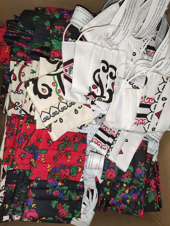 Regionalne maseczki trafiają do mieszkańców Podhala dzięki paniom z Kół Gospodyń Wiejskich z Nowego Bystrego, z Bukowiny Tatrzańskiej i z Brzegów oraz firmie Lavard ze Starego Bystrego, które z przekazanego materiału uszyły bawełniane maseczki.
