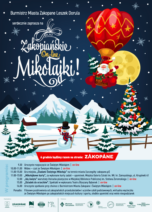 Czat wideo z Mikołajem, spektakl „Dziadek do orzechów”, zabawy edukacyjno – artystyczne z nagrodami, filmy z pozdrowieniami zakopiańskich milusińskich oraz życzenia od Świętego Mikołaja oraz Burmistrza Miasta płynące z pięknych góralskich wnętrz Czerwonego Dworu - to tylko niektóre atrakcje przygotowane dla naszych najmłodszych.
