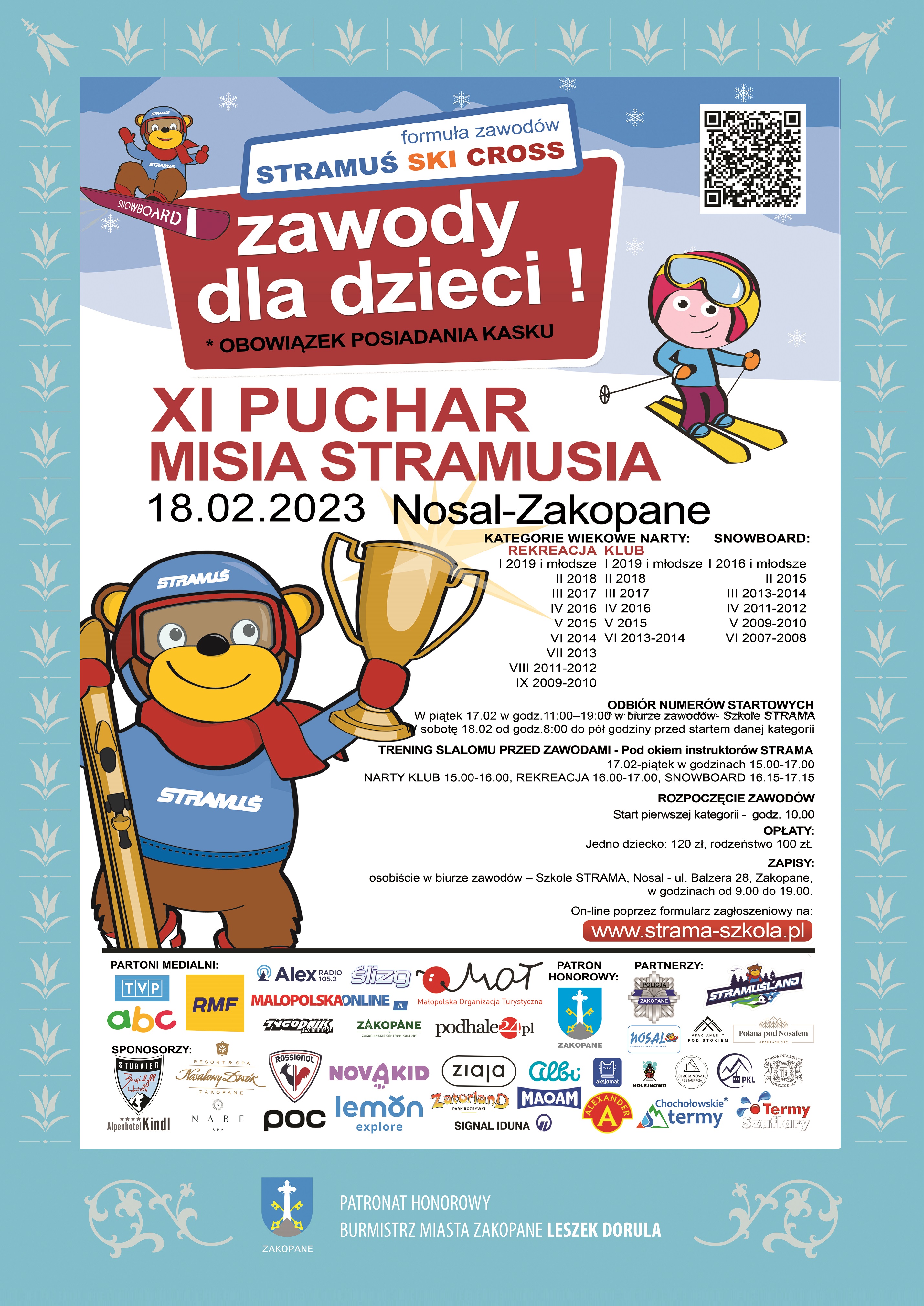 Zapisy: https://strama-szkola.pl/swiat-misia-stramusia/puchar-misia-stramusia lub osobiście w Szkole Narciarskiej i Snowboardowej STRAMA