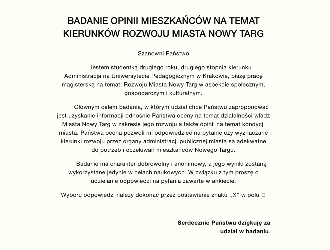 - Głównym celem badania, jest uzyskanie informacji odnośnie oceny na temat działalności władz Miasta Nowy Targ w zakresie jego rozwoju, a także opinii na temat kondycji miasta. Ocena społeczności lokalnej pozwoli mi odpowiedzieć na pytanie czy wyznaczane kierunki rozwoju przez organy administracji publicznej miasta są adekwatne do potrzeb i oczekiwań mieszkańców Nowego Targu.