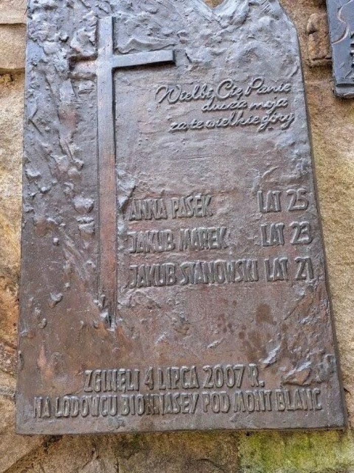 Lecz miejsce to ma szczególny przekaz; dziesiątki pamiątkowych tabliczek ludzi, którzy w górach pozostawili swe życie. Są tu nazwiska sławnych himalaistów i taterników, ale także i mniej znanych, jak choćby tych, którzy zamarzli w Alpach, nie chcąc pozostawić bez opieki rannej koleżanki. Wśród tej trójki młodych ludzi był 23-letni nowotarżanin, Kuba Marek…