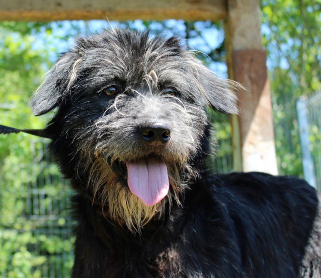 - pies, średni, czarno-siwy, szorstkowłosy, 1 rok