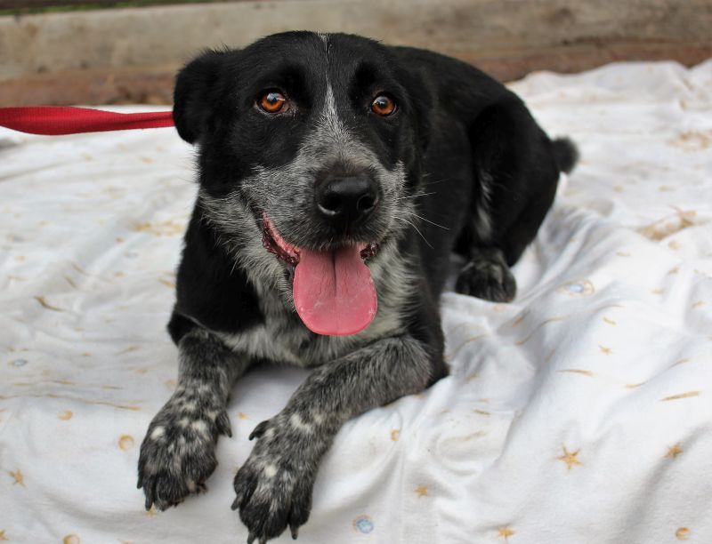 - pies, średni, czarny z białym krawatem, białymi nakrapianymi łapami, gładki, 1,5 roku