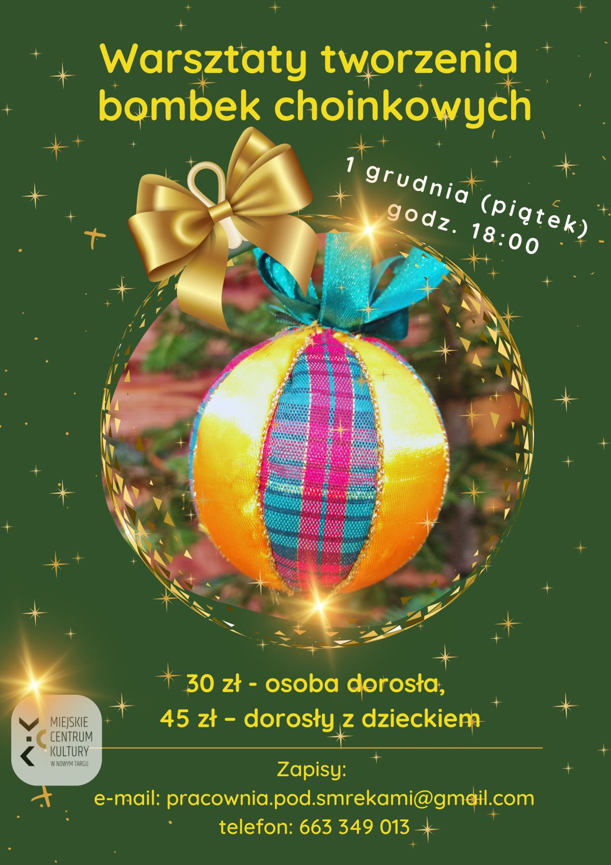 Bazą będą kule styropianowe, które ozdabiać będziemy różnymi technikami, głównie wstążkami. Do dyspozycji uczestników będą także koraliki, cekiny, piórka, koronki, ozdobne sznureczki itp. Warsztaty przeznaczone dla osób dorosłych i dzieci pod opieką osoby dorosłej. Koszt warsztatów: 30 zł - osoba dorosła, 45 zł – dorosły z dzieckiem. Czas trwania warsztatów: 1,5 - 2 godziny. Zapewniamy niezbędne materiały i akcesoria. Zapisy: e-mail: pracownia.pod.smrekami@gmail.com lub tel.: 663 349 013.