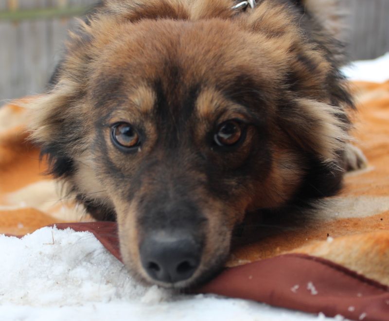 - suka, mała, brązowa z czarnym pyskiem, kudłata, 10 miesięcy