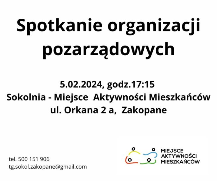 "Jeśli działacie jako organizacja pozarządowa na terenie powiatu tatrzańskiego, warto wybrać się do Zakopanego, gdzie w poniedziałek 5 lutego o godzinie 17:15 odbędzie się spotkanie lokalnych NGO. Spotkanie ma na celu wzajemne poznanie się organizacji i ludzi działających w przestrzeni społecznej. Odbędzie się ono w Sokolni - Miejscu Aktywności Mieszkańców, siedzibie Towarzystwa Gimnastycznego „Sokół” z Zakopanego. Przestrzeń ta od niedawna funkcjonuje w życiu zakopanego, ale już zyskała duże zainteresowanie społeczników i mieszkańców miasta" - piszą w zaproszeniu organizatorzy.