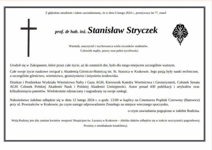 6 lutego 2024 r. w Krakowie zmarł pochodzący z Zakopanego prof. dr hab. inż. Stanisław Stryczek, wieloletni wykładowca i pracownik naukowy Akademii Górniczo-Hutniczej im. St. Staszica w Krakowie, członek Polskiej Akademii Nauk.