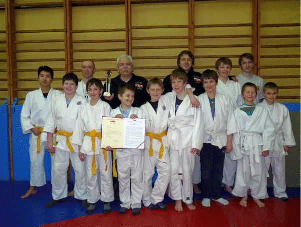 Na zdjęciu trener - Zenon Zych wraz z zawodnikami i instruktorem Wojciechem Zychem który statuetkę odbierał.