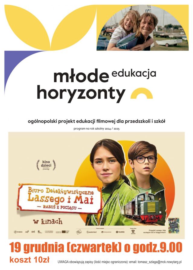 Kolejne spotkanie odbędzie się 19 grudnia (czwartek) o godz.9.00. Przedstawiony będzie film "Biuro Detektywistyczne Lassego i Mai. Rabuś z pociągu" (reż. P. Klange, W.Soderlund, prod. Szwecja 2020, 91min, dubbing) oraz prezentacja odnosząca się do kraju jakim jest Szwecja.