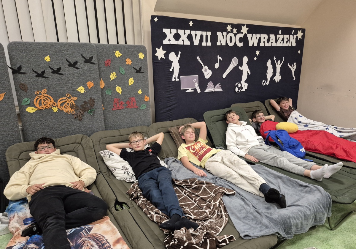 Jak zawsze spotkanie otworzył dyrektor Piotr Malinowski, który 10 rok z rzędu kieruje zębiańską szkołą i jest pomysłodawcą tego cyklu imprez. Goście sportowcy mówili o spełnianiu marzeń, potrzebie sprawności fizycznej, zdrowym trybie życia, determinacji, pasji i oczywiście sukcesach. Uczyli także młodzież samoobrony. Tomasz Mateusiak przybliżył uczniom świat mediów, zasady funkcjonowania w social mediach i zagrożenia czyhające na młodych ludzi. Mówił także o fake newsach i tłumaczył, jak je rozpoznać. Zaznaczył, jak istotna jest potrzeba posiadania ogólnej wiedzy o świecie, Polsce i regionie. Multiistrumentalista Kuba Bobas Wilk zabrał natomiast wszystkich zgromadzonych w muzyczną podróż. Opowiadał o fascynacji dźwiękami, swoich dokonaniach i współpracy z wieloma artystami. Zachęcał do spełniania marzeń i nie poddawania się w dążeniach do celu. Na koniec dał też popis swoich umiejętności gry na gitarze. W programie wieczoru znalazły się też m.in. wspólna kolacja, zawody sportowe, pamiątkowe zdjęcia no i oczywiście nocleg w szkole. Opiekę nad młodzieżą sprawowali p. Bartłomiej Sawera oraz p. Ewa Worwa. Kolejna Noc Wrażeń w ZSP w Zębie zaplanowana została na piątek 5 grudnia 2025 r.