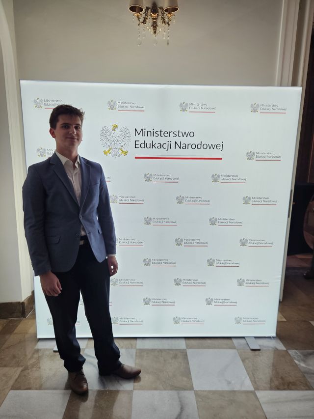 Maciej Klamerus - zwycięzca Olimpiady Wiedzy o Turystyce, który osobiście odebrał gratulacje od minister oraz
