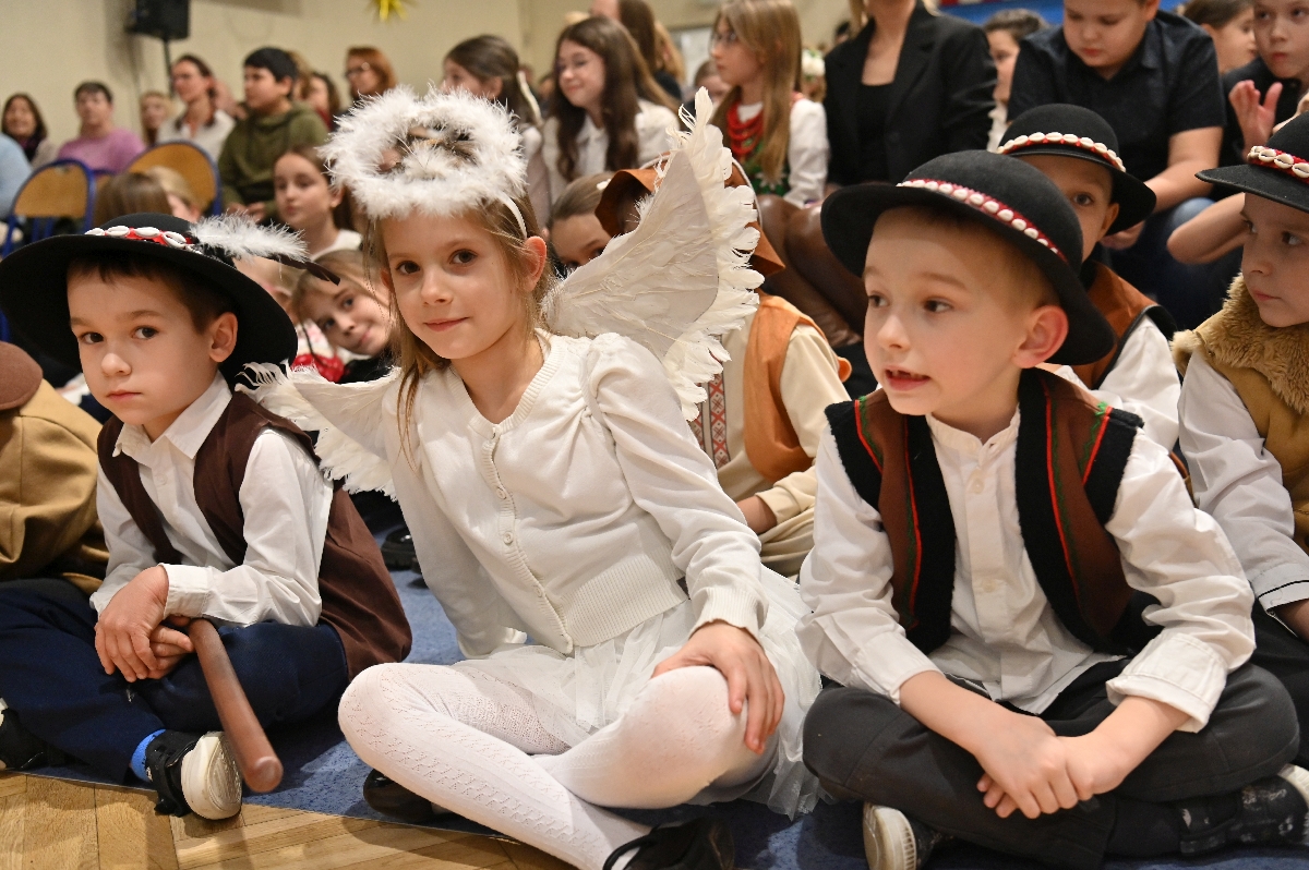 Dzieci śpiewały kolędy z ogromnym zaangażowaniem - zarówno podczas występów solowych, jak i klasowych. Wieczór uświetnili także zaproszeni goście: Tomasz Modranka z Akademii Gitary, który wprowadził publiczność w refleksyjny, muzyczny nastrój dźwiękami gitary. Wraz z nim na gitarach wystąpili również bracia Hubert i Jakub Zasadni, wzbogacając występ o wspólne, harmonijne brzmienie. Kolejnym gościem był Wojciech Inglot z córką Julią. Młoda artystka zaprezentowała swój talent, grając na ksylofonie.