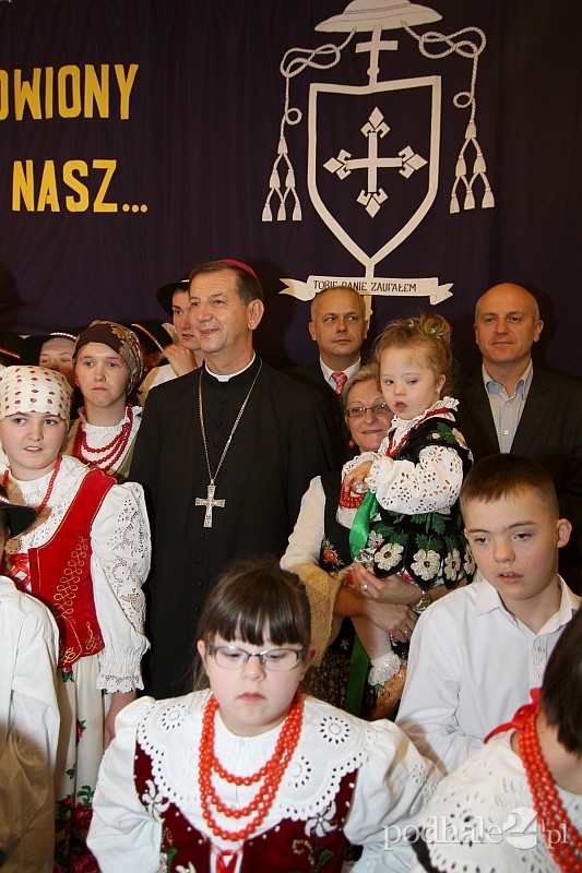 Na uroczyście przystrojonej jadalni na ks.Biskupa oczekiwały delegacje klas poszczególnych szkół, przedstawiciele nauczycieli, rodziców, pracowników obsługi, dyrekcja oraz zaproszeni goście – w tym pan wicestarosta Maciej Jachymiak. Wśród zgromadzonych, szczególnie odznaczały się wystrojone po góralsku Milusioki – zespół działający w naszej placówce oraz ministranci ubrani w białe komże. To na nich w pierwszym rzędzie zwrócił uwagę ks. Biskup wchodząc do sali, do której był wprowadzony przez pana Dyrektora, przy dźwiękach kapeli góralskiej. Dyrektor SOSW Nr 1 po powitaniu Czcigodnego Gościa, w krótkich słowach przedstawił naszą placówkę. W dalszej kolejności mikrofon został przekazany Milusiokom, którzy po góralsku: wierszem, śpiewem i tańcem przywitali ks.Biskupa.