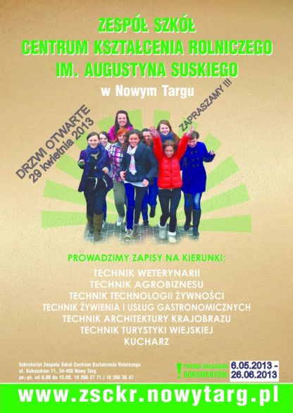NOWY TARG. Dyrektor, Nauczyciele i Uczniowie Zespołu Szkół Centrum Kształcenia Rolniczego im. Augustyna Suskiego zapraszają młodzież klas III gimnazjum na „Dzień Otwarty na Kokoszkowie” - w poniedziałek 29 kwietnia w godz. od 10.00 do 14.00.