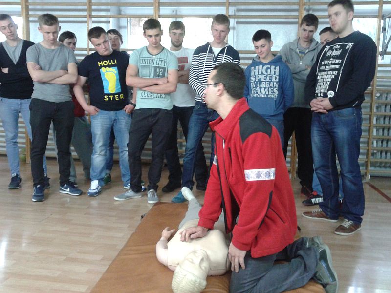 Kolejnym punktem akcji było uczestniczenie w pokazach udzielania pierwszej pomocy przedmedycznej, gdyż jak się okazuje to często jedyna szansa dla osób poszkodowanych w wypadku, zanim dotrze profesjonalna pomoc medyczna. W trakcie pokazów młodzież dowiedziała się miedzy innymi co to jest pozycja bezpieczna i jak zachować się w sytuacji wypadku. Przedstawiono jak postępować w przypadku osoby nieprzytomnej i nie oddychającej, ćwiczono także resuscytację krążeniowooddechową, czyli RKO.