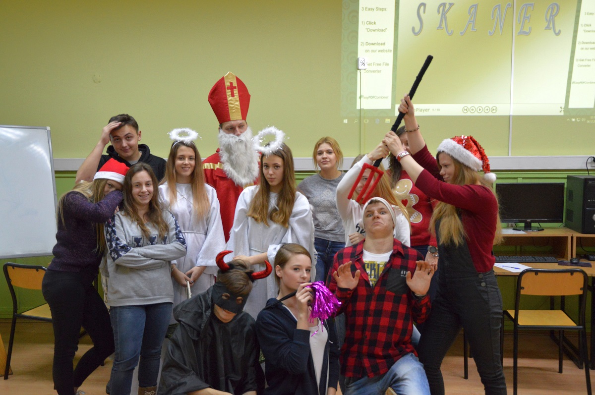 Diabełek był w swoim żywiole – ogonem „smyrał” dziewczyny i szkolne niecnoty, a widełkami szturchał. Jego popisy przyjmowane były z uśmiechem. Aniołki nieco łagodziły diabelskie figle słodkościami, a Mikołaj z dobrotliwym uśmiechem na twarzy głaskał główki uczniowskie. Niektórzy powiadają, że osoba Świętego bardzo przypominała prof. M. Pawłowskiego. Oceńcie sami oglądając zdjęcia.