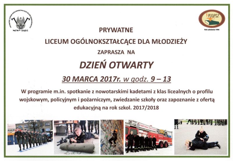 Nowotarscy kadeci z Prywatnego Liceum Ogólnokształcącego dla Młodzieży w Nowym Targu zapraszają zainteresowanych gimnazjalistów na DZIEŃ OTWARTY, który odbędzie się w czwartek 30 marca br. w godz. od 9.00 do 13.00. w budynku szkoły przy ul. Św. Katarzyny 1.