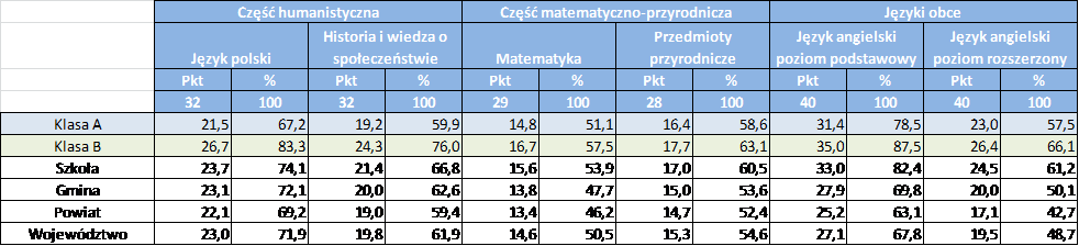 Język polski jest wyżej o kilka procent (klasa ogólna ponad 10% lepiej), podobnie sprawa przedstawia się z Historią i Wiedzą o Społeczeństwie oraz Przedmiotami Przyrodniczymi oraz Matematyką (klasa ogólna 10% lepiej od średniego wyniku Gminy i Powiatu).