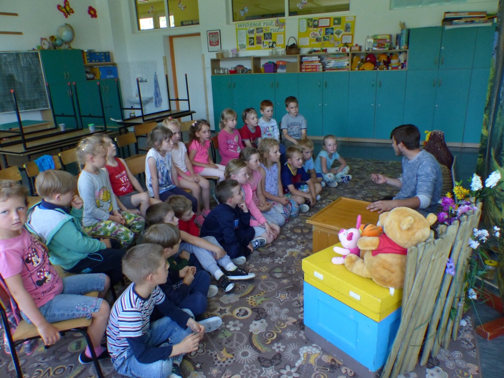 Gość w bardzo ciekawy, wręcz baśniowy sposób przybliżał najmłodszym naszym uczniom życie i zwyczaje pszczół. Opowiadał z ogromną swadą, czego uczniowie słuchali z otwartymi buziami. Swoje opowieści poparł przywiezionymi rekwizytami, fotografiami, planszami.