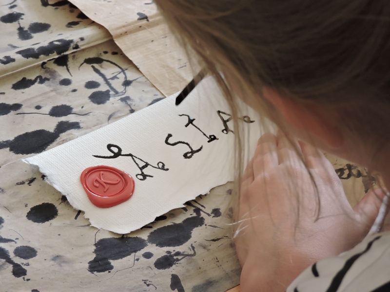 Uczestniczące w zajęciach dzieci wyszły z nich bogatsze w wiedzę, zdobyte umiejętności oraz własnoręcznie wykonane prace: wyczerpany papier, odbitą pieczęć lakową, barwioną kartkę papieru techniką japońską oraz samodzielnie wykaligrafowane gęsim piórem imię. Efekty pracy zaskoczyły wszystkich uczestników warsztatów.