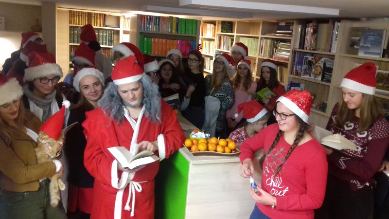Czerwony kolor mikołajowych czapek opanował szkolne korytarze, wtargnął do sal lekcyjnych i nie ominął biblioteki szkolnej. Każdy, kto w tym dniu zawitał po książkę, miał szansę zasmakować „mikołajkowego wypożyczania”. W nagrodę za odpowiedź na „arcytrudną” literacką zagadkę mógł otrzymać słodki upominek. Śmiałków nie brakowało.