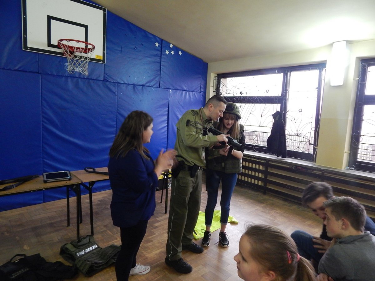 Uczniowie zostali zapoznani z charakterystyką służby w Straży Granicznej. Mieli również możliwość osobistego wcielenia się w rolę strażnika granicznego oraz zapoznania ze sprzętem wykorzystywanym na co dzień do służby.