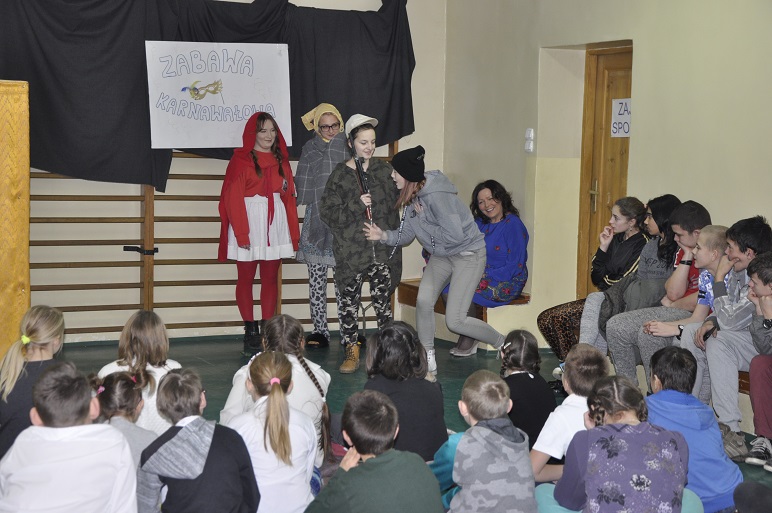 Młodzież przygotowała przedstawienie pt. „ Czerwony kapturek”, a ich profesjonalna gra aktorska i wspaniałe stroje pozwoliły wszystkim przenieść się w iście baśniowy świat. Gry i konkursy wprawiły uczestników w wesoły nastrój, a otrzymywane nagrody sprawiły dzieciom wielką radość. Nie zabrakło także czasu na edukację. W przerwach między zabawami i tańcami starsze koleżanki czytały dzieciom bajki, a następnie sprawdzały umiejętność słuchania ze zrozumieniem, zadając uczniom szczegółowe pytania. Niestety to już ostatnie nasze spotkanie, bowiem nasi stali dobroczyńcy kończą w tym roku szkolnym szkołę. Pozostaje nam wierzyć, że w kolejnych latach uczniowie młodszych klas Zespołu Szkół Centrum Kształcenia Rolniczego godnie ich zastąpi. My w tym miejscu serdecznie dziękujemy za wszystkie spotkania pełne inspirujących pomysłów, które sprawiały dzieciom olbrzymią radość, budziły piękne emocje, zostawiły szereg wspaniałych wspomnień i edukowały- bawiąc. Niech słowa poniższej maksymy podsumują waszą kilkuletnią pracę na rzecz dzieci i wyrażą naszą wdzięczność za wszystkie podejmowane inicjatywy „ Niektórzy ludzie to anioły bez skrzydeł, i to jest właśnie takie piękne, urodzić się bez skrzydeł i wyhodować je sobie.”