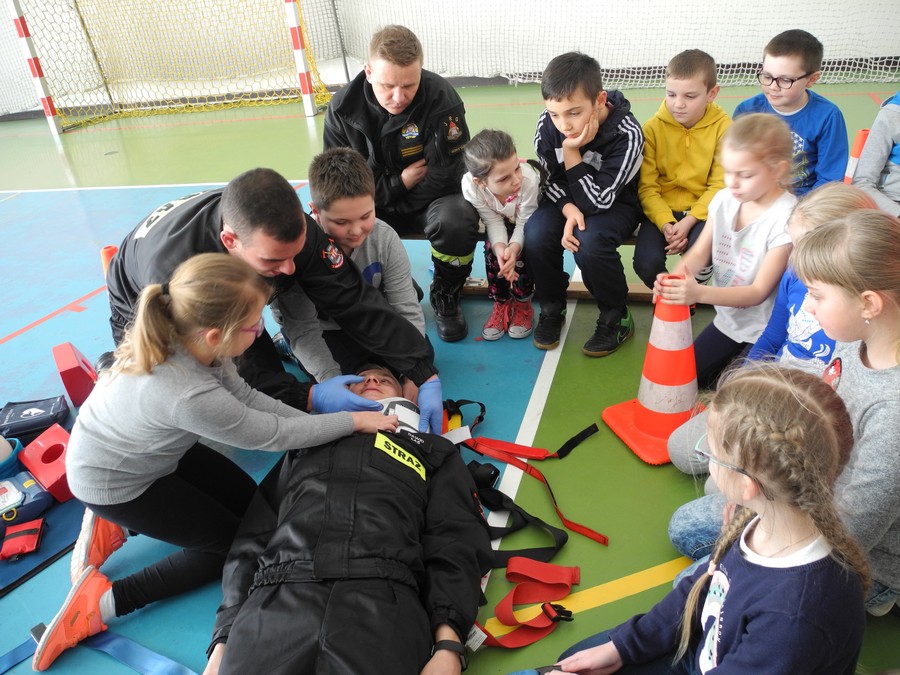 Strażacy z PSP we współpracy ze strażakami z OSP zaznajamiali podopiecznych z prawidłowymi reakcjami w różnych sytuacjach zagrażających życiu człowieka. Pokazali więc jak zabezpieczyć miejsce zdarzenia, osobę poszkodowaną, a także jak prowadzić resuscytację krążeniowo-oddechową z użyciem defibrylatora AED. W ramach tego uczniowie mieli możliwość wykonania masażu serca na profesjonalnym fantomie.