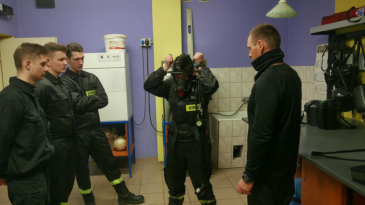 Kadeci strażacy na zajęciach w JRG poznawali właśnie budowę aparatu powietrznego, działanie sygnalizatora bezruchu, sposób zakładania aparatów i zasady pracy w nich. Dzięki temu mieli okazję poczuć się tak, jak strażacy w akcji.
