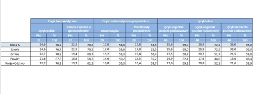 Język angielski jest o ponad 20% wyższy od średniej na tle innych szkół w gminie, powiecie i województwie, choć i w poprzednich latach, w oddziałach, które nie były dwujęzyczne wynik egzaminu gimnazjalnego z języka angielskiego, zarówno na poziomie podstawowym jak i rozszerzonym, był znacząco wyższy.