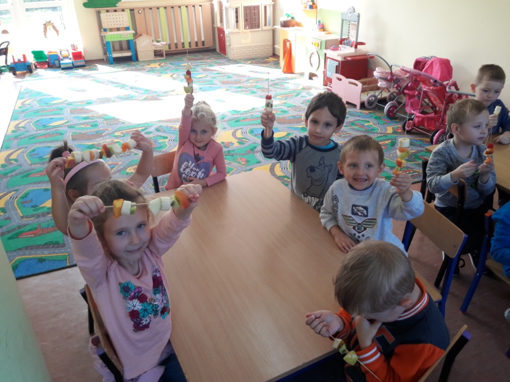 Przed samym wykonaniem szaszłyków dzieci nazywały owoce, porównywały, przeliczały, a następnie dokładnie je myły. Kiedy wszystko już było gotowe, dzieci kroiły owoce i nabijały na patyczki. Zajęcie to sprawiło dzieciom dużo radości i satysfakcji. Po skończonej pracy i uporządkowaniu stoliczków z wielkim apetytem wszystkie dzieci zjadły przygotowane własnoręcznie szaszłyki.