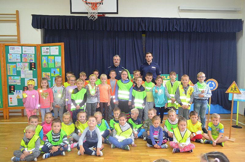 Szkołę odwiedzili policjanci, którzy przeprowadzili pogadankę na temat bezpieczeństwa. Rozmowy były dostosowane do wieku uczniów i podzielone na 2 grupy wiekowe. Policjanci przekazali uczniom, m.in.: zasady bezpiecznego zachowania się w domu, szkole oraz w ruchu drogowym. Zwrócono szczególną uwagę na znajomość numerów telefonów alarmowych oraz noszenie elementów odblaskowych, dzięki którym zawsze jesteśmy widoczni na drodze. Uczniowie zaznajomili się z powagą bezpieczeństwa w samochodzie podczas jazdy. Padały ciekawe pytania uświadamiające dzieciom zagrożenia, które mogą spotkać osoby lekkomyślne.
