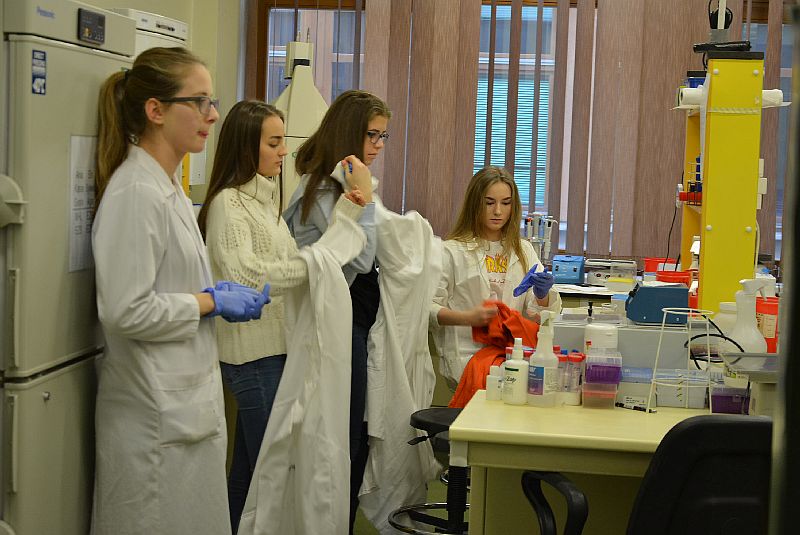 Mimo wielu zajęć Dziekan zaszczycił ich na krótko swoją obecnością, przywitał i wyraził zadowolenie z powodu wizyty w Zakładzie Biologii Komórki. Uczniowie brali udział w dwóch wykładach: dr hab. Jolanty Sroki na temat migracji komórek zwierzęcych oraz dr hab. Justyny Drukały o produkcji komórek macierzystych skóry i leczeniu uszkodzeń skóry tymi komórkami macierzystymi. Niezwykle ciekawe treści przyciągnęły uwagę młodzieży. Po wykładach uczniowie wraz z opiekunami zostali oprowadzeni po Zakładzie Biologii Komórki przez dr Sylwię Bobis- Wozowicz –również absolwentkę jabłońskiego liceum, gdzie mieli możliwość posłuchać o jej pracy badawczej, zobaczyć laboratoria i sprzęty wykorzystywane w pracy naukowej a nawet samodzielnie poćwiczyć.