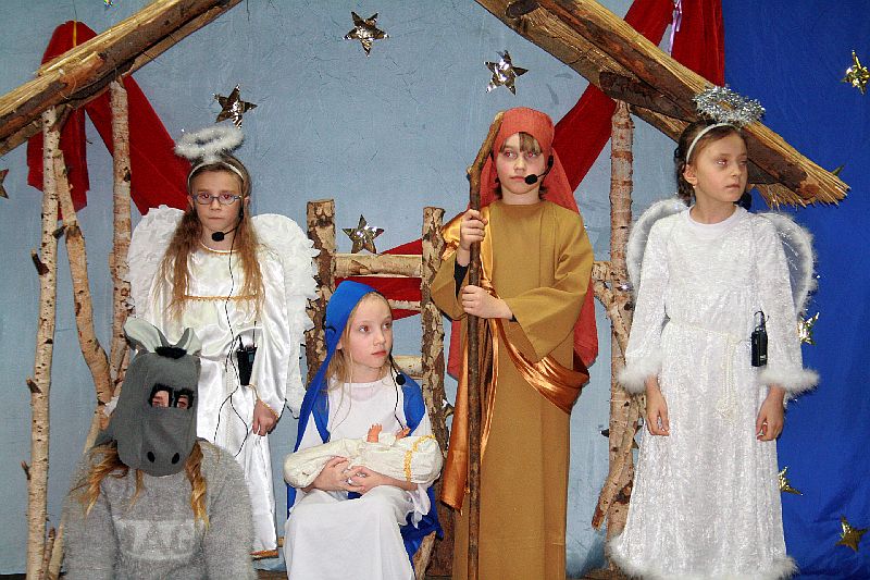 Aby podkreślić wyjątkowość zdarzenia, organizatorzy zdecydowali w tym roku powrócić do tekstów Wandy Chotomskiej, które to ostatni raz zostały wystawiane 25 lat temu podczas pierwszych jasełek. W tym roku w przedstawieniu wzięły udział dzieci z klas od 1 do 4 oraz przedszkolaki. Młodzi aktorzy stanęli na wysokości zadania o czym świadczyły gromkie brawa. Błyskotliwe i humorystyczne sceny w wykonaniu naszych najmłodszych uczniów budziły wielką sympatię i uśmiech na twarzach. Wielkie wzruszenie wzbudziła postać Jana Pawła II w stajence betlejemskiej, który zwracając się ku widowni wypowiada znamienne słowa: ,,Niech zstąpi Duch Twój i odnowi oblicze Ziemi – Tej Ziemi..” Ze łzami w oczach goście wysłuchali finalnej kolędy: ,,Podnieś rączkę Boże Dziecię..”.