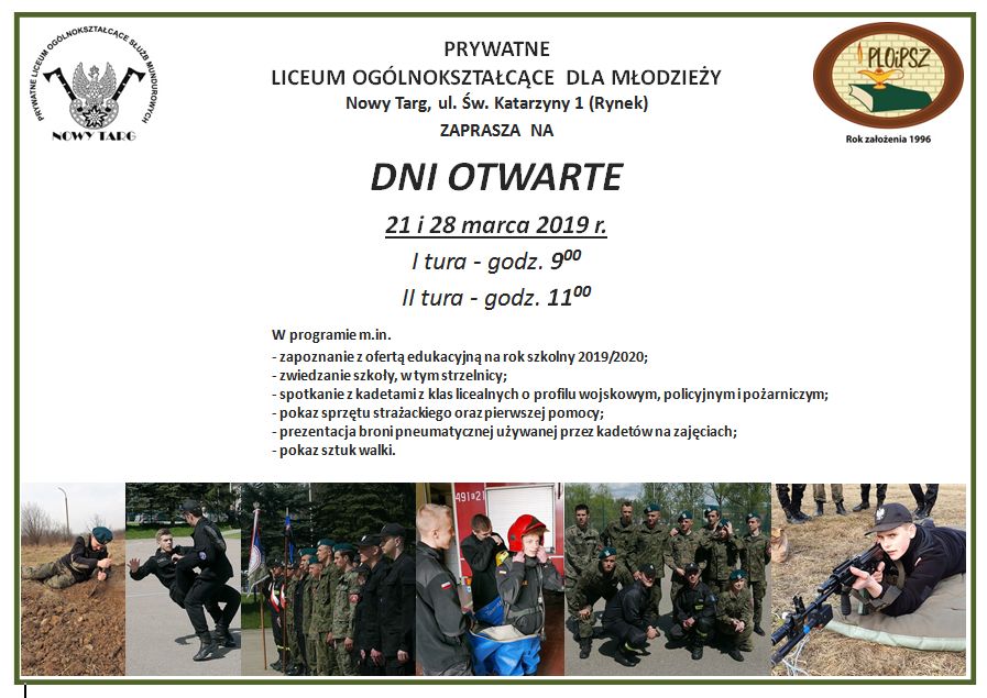 W programie m.in. zwiedzanie budynku szkoły przy ul. Świętej Katarzyny 1 w Nowym Targu, w tym strzelnicy, spotkanie z uczniami klas mundurowych, zapoznanie uczniów z ofertą edukacyjną szkoły i wiele innych.